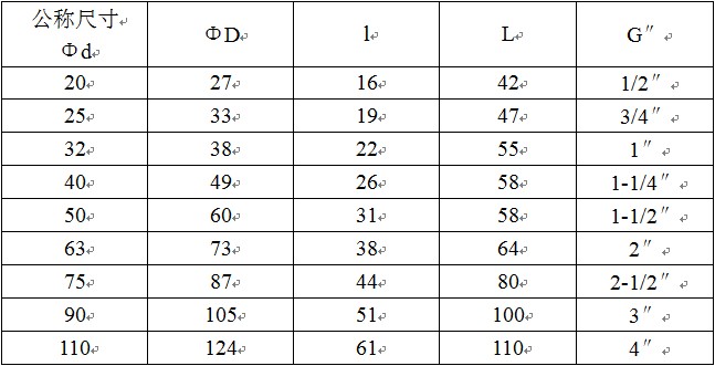 其中“G″”表示管件丝口直径,“L”管件长度,“l”表示承插口长度,“Φd”表示管件公称内径,“ΦD”管件公称外径,1.0MPa=10公斤