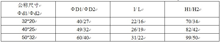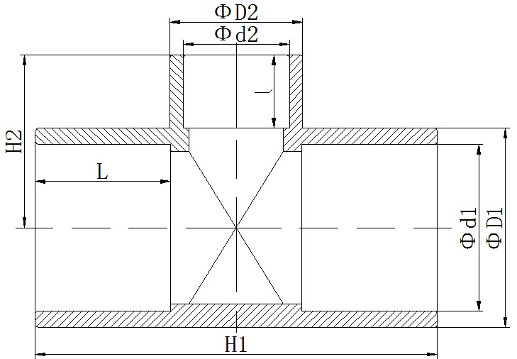 其中“ΦD1”表示管件主管口公称外径,“Φd1”表示管件主管口公称内径,“ΦD2”表示管件支管口公称外径,“Φd2”表示管件支管口公称内径,“L”管件主管口承插长度,“l”表示管件支管口承插长度,“H1”管件长度,“H2”表示管件中心距,1.0MPa=10公斤